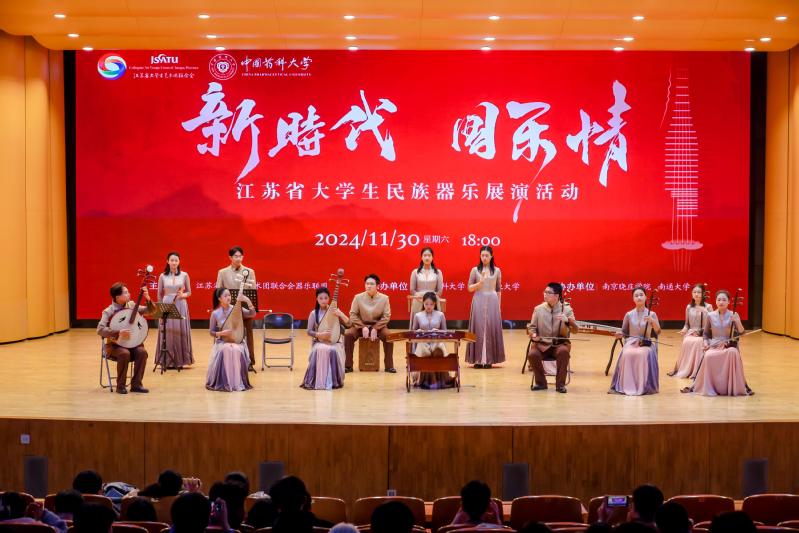 2024年11月30日,为庆祝中华人民共和国成立75周年,进一步推进落实学校美育浸润行动计划,发挥省级大学生艺术团示范引领作用,加强各高校器乐艺术团交流,提升高校艺术团器乐合奏演奏水平。由江苏省大学生艺术团联合会器乐联盟主办,中国药科大学、南京工业大学承办,南京晓庄学院、南通大学协办的“新时代 国乐情”——江苏省大学生民族器乐展演活动在中国药科大学江宁校区大礼堂成功举办。全省18所高校的民乐团师生汇聚一堂,交流互鉴。诸多展演作品各具特色,乐手们娴熟的演奏技巧传神地展现出民乐之风雅。丝竹管弦和鸣,尽显显青春风貌,共颂盛世华章。我校民族乐团携民族室内乐合奏《山语·幻》精彩亮相,展现南医学子的奕奕神采。