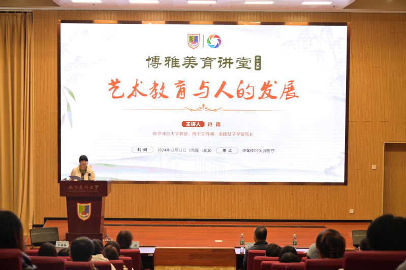 12月12日18:30,博雅美育讲堂第十五讲在我校江宁校区德馨楼D201报告厅成功举办。南京师范大学教授、博士生导师、金陵女子学院院长边霞老师受邀作为主讲人,为我校师生带来《艺术教育与人的发展》主题讲座。我校学生工作处副处长、文化艺术教育中心副主任王铭泽,文化艺术教育中心艺术实践部主任季婕颖老师、胡菁菁老师,天元书院学生事务中心学生工作办公室主任熊潇老师、辅导员张婷老师及本研学生代表两百余人共同参与。讲座由我校文化艺术教育中心胡菁菁老师主持。