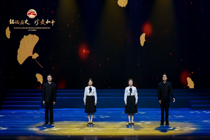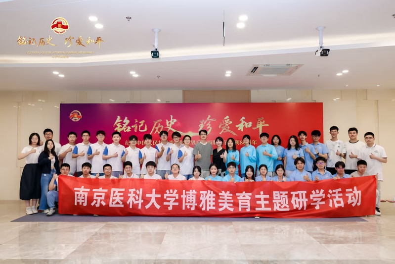 原创作品《银杏记得》由南京师范大学中国语言文学专业2023级本科生陈晓藩创作。我校医馨朗诵团徐敏源、马腾飞、王学敏、周忆梦4位同学借银杏之“眼”,铭记先辈壮举,以朗诵之姿,致敬永不褪色的民族脊梁 ,他们的演绎将这份对历史的敬意与传承,在舞台上熠熠生辉。朗诵团成员在排练初期面临配合生疏、细节把握不足等问题。指导老师针对性地纠正字音、解析稿件情感,并示范语言节奏。队员们反复打磨个人表达,并通过镜前练习统一动作。经过持续刻苦训练,整体水平显著提升。此外,我校还组织了由第一临床医学院、公共卫生学院、医学影像学院等40余名同学组成,共同开展了一次博雅美育主题研学活动,现场观摩了此次演出,沉浸式的感受了一堂爱国主义美育课堂。